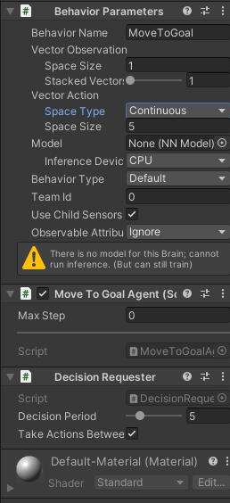 이제 유니티로 돌아가 오브젝트를 하나 만든 후 해당 스크립트와 통신을 받을 수 있는 스크립트인 Decision Requester