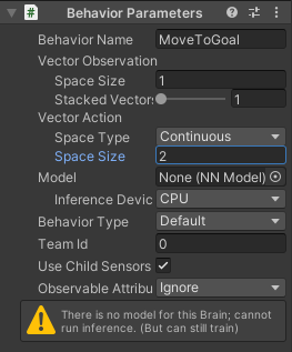 Behavior Parameters에 Branches Size는 데이터를 전송받는 사이즈라고 보시면 됩니다.